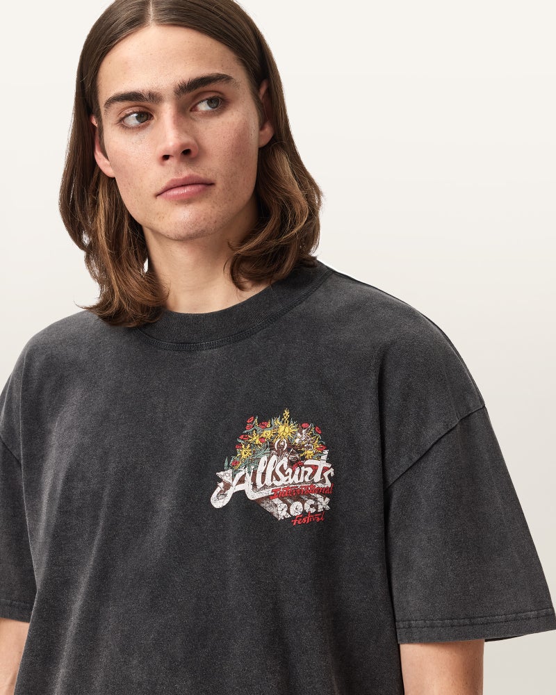 Roque Tシャツ は、手描きのロックフェスティバルグラフィックが印象的な一枚。