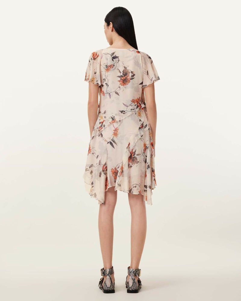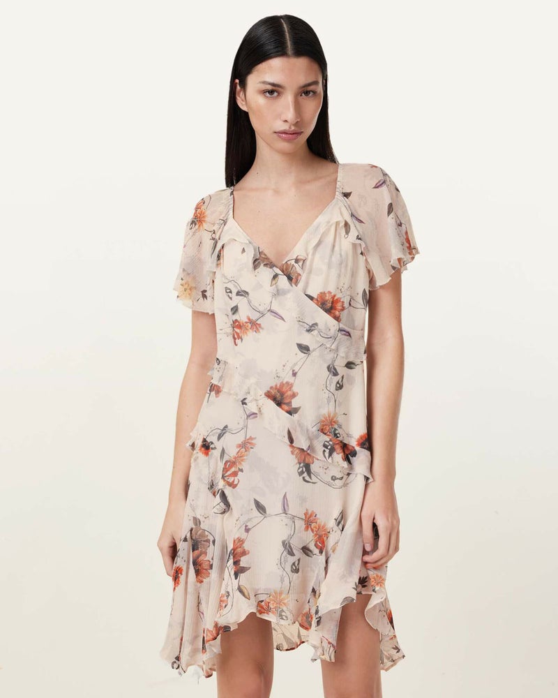 春らしい雰囲気のDarma ドレスはフローラル&リーフプリントが華やかなミニ丈ドレス。ラップシルエットに繊細なフリルをあしらい、フェミニンな雰囲気を演出。シグネチャーのアシンメトリーヘム仕上げ。バックル付きフラットシューズと合わせてエッジを効かせたスタイリングで着こなそう。