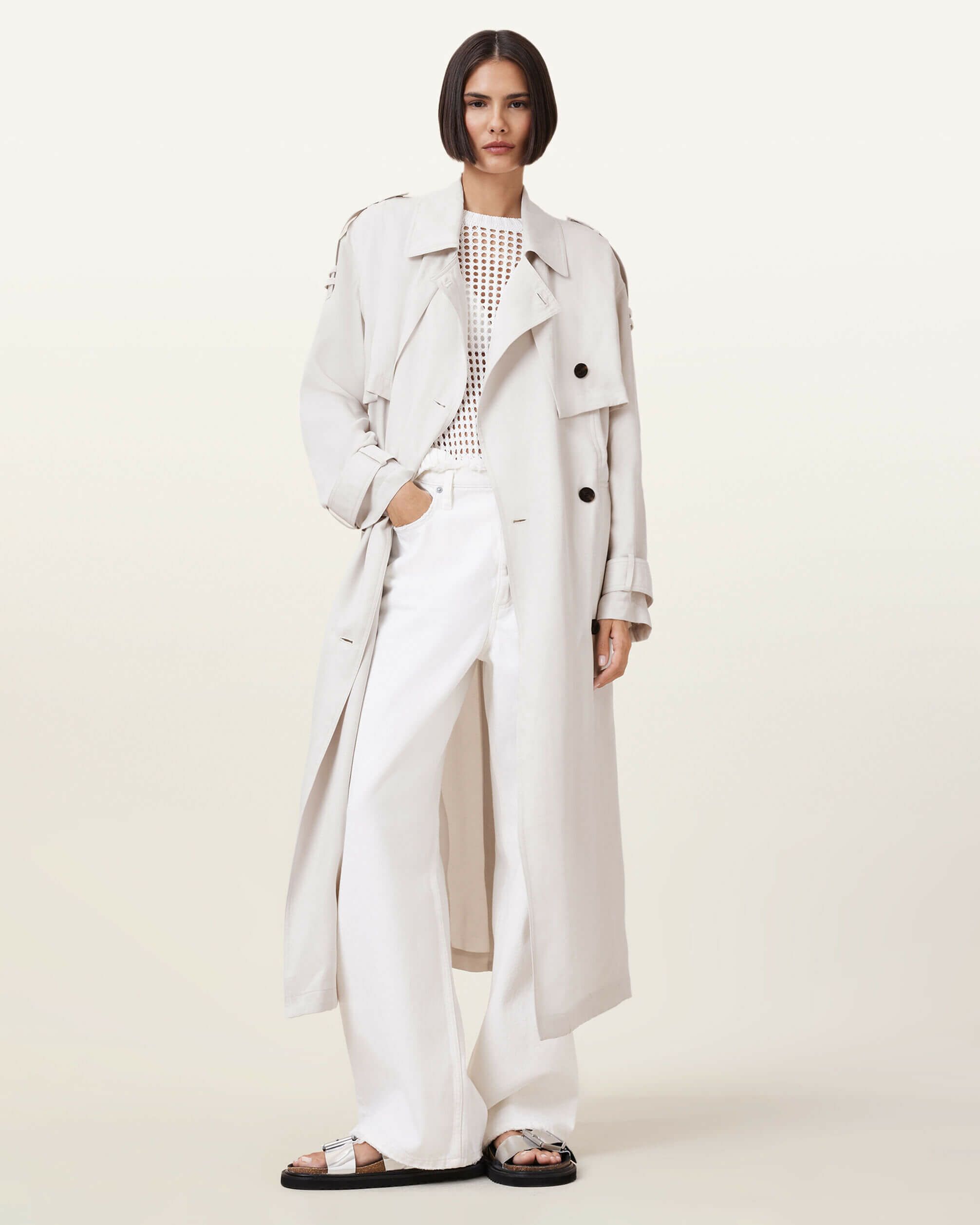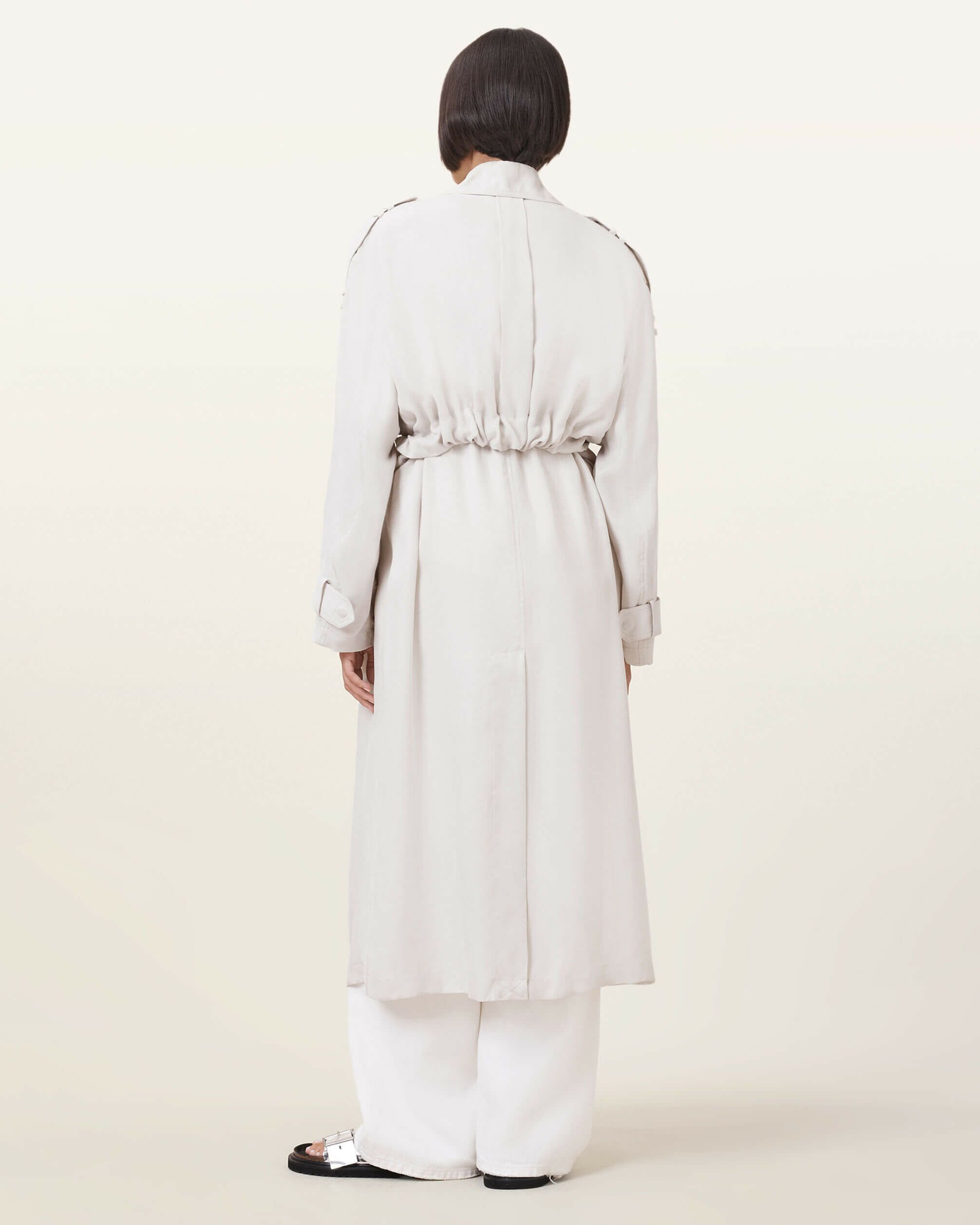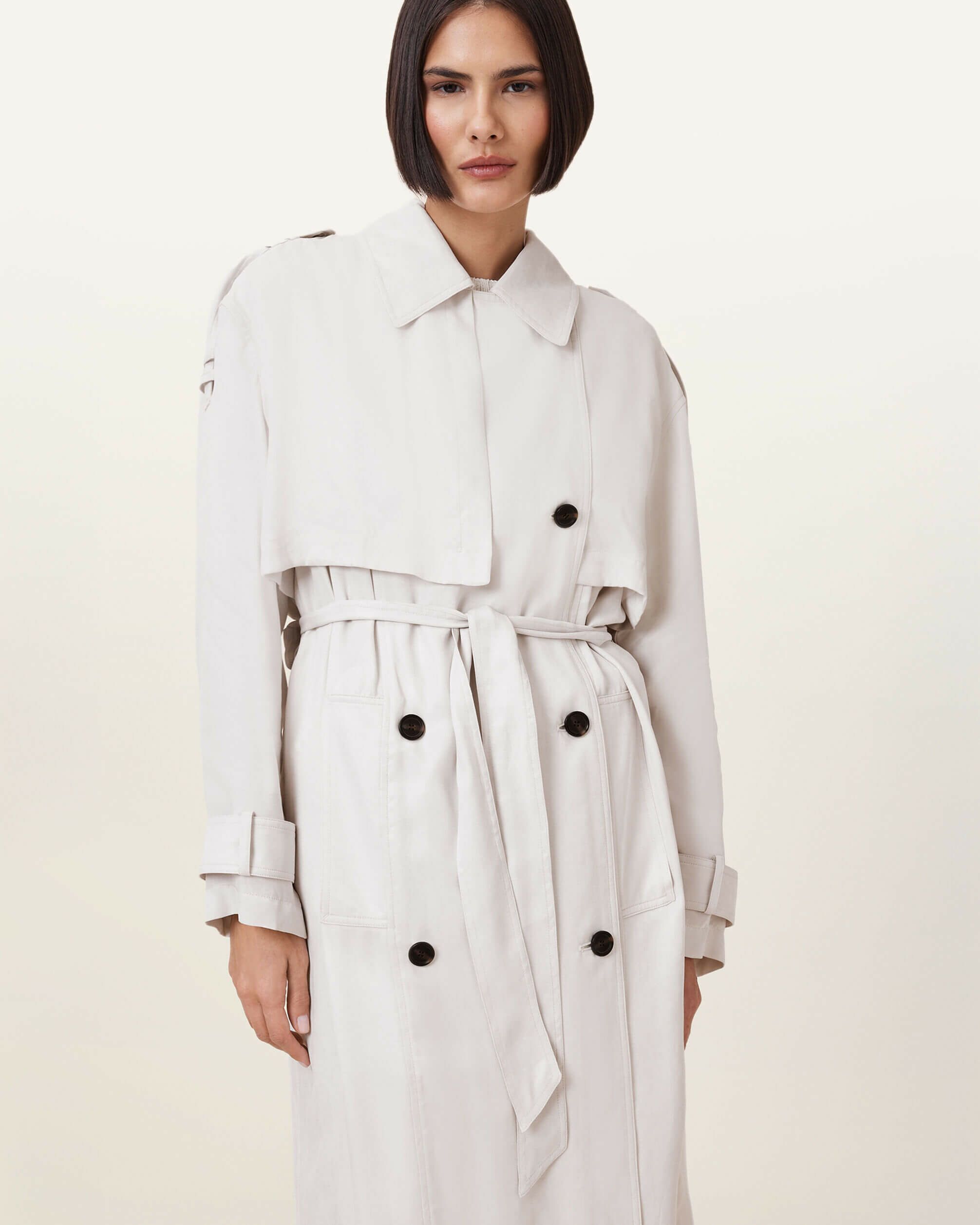 軽やかなレイヤードスタイルを楽しむ時。Linnieトレンチは、滑らかな生地を使用し、バランスの取れたレギュラーシルエットに仕立てた一着。ウエストのセルフタイベルトでシルエットを調整できます。仕上げのステッチディテールは、カフスとベルトに施されています。