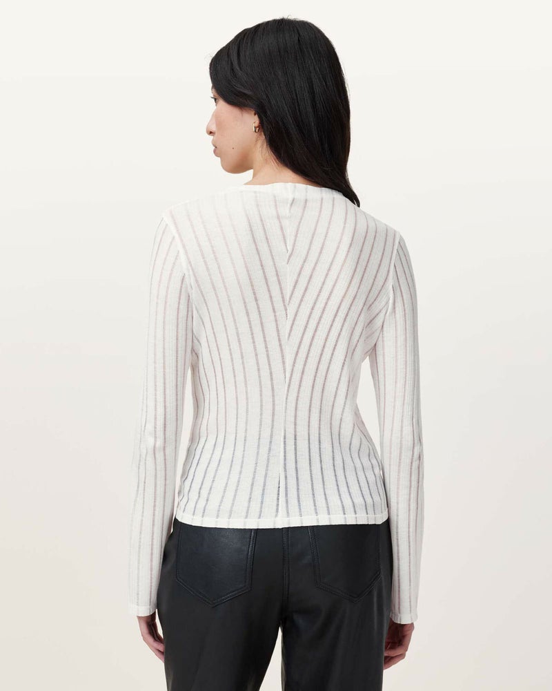 Aki ティーは、ロングスリーブとカフス部分にフレアが施され、デザインにダメージステッチが加わり、着古したような雰囲気を演出。ハイウエストジーンズと合わせて、定番スタイルを完成させて。