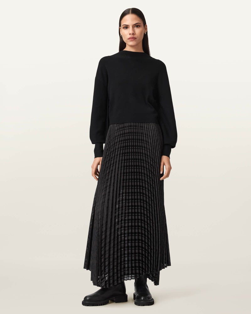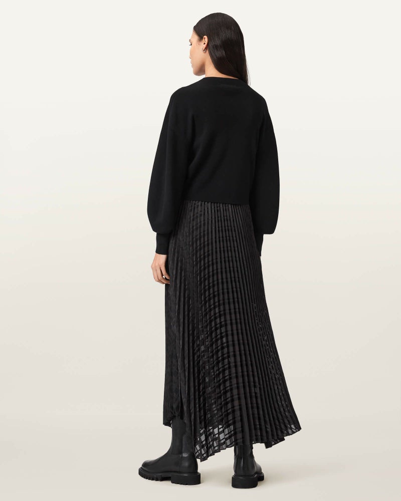 Sinead 2-in-1プリーツドレスは、ニットとドレスが一体となったアイテム。リブ仕様のトップと、動きのあるプリーツスカートが、ほんのりパンクなムードに。