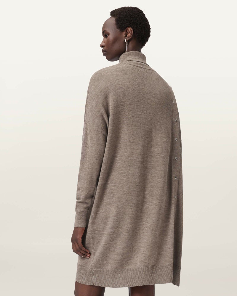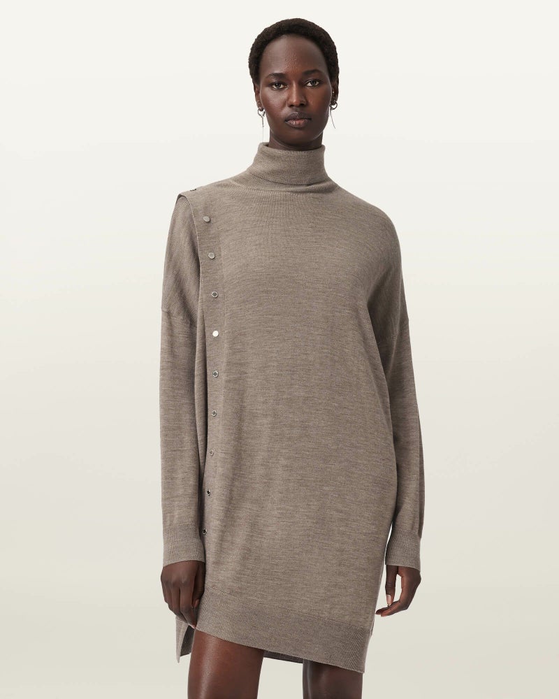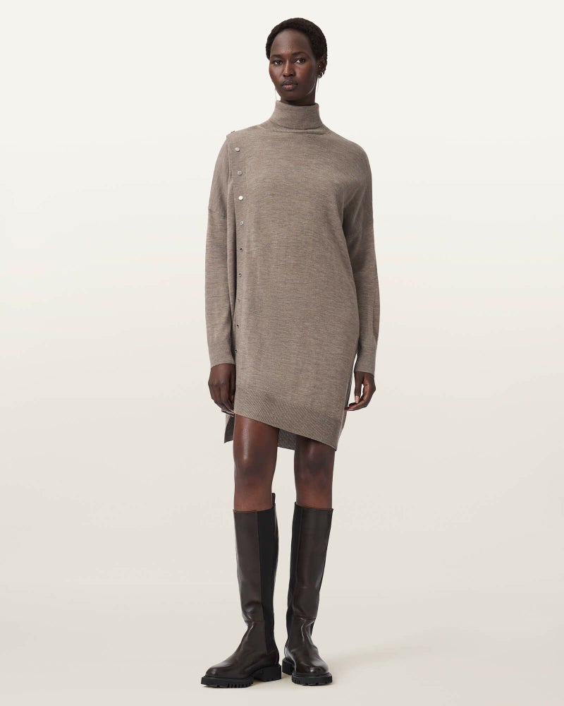 Umiドレスは、ゆったりとしたシルエットとアシンメトリーヘムが魅力の一着。ロールネックやサイドのブランドボタンがアクセントに。品のある抜け感で、日常を少しだけ特別に。