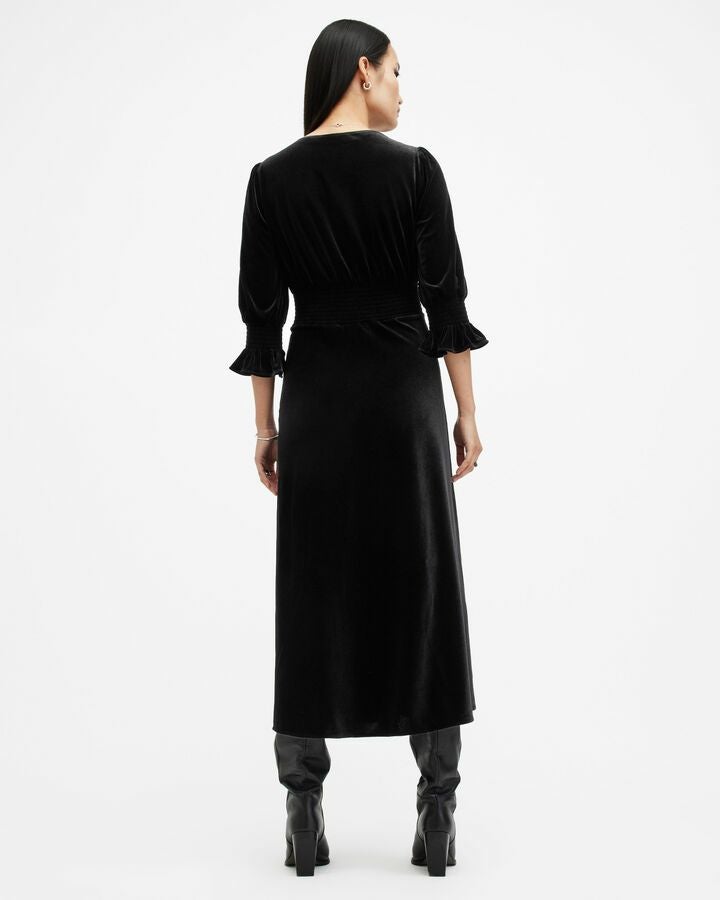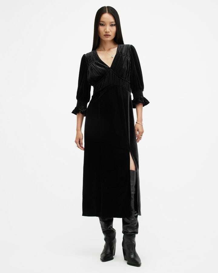 なめらかなベルベットと洗練されたシルエットのAni ドレスはリサイクルファブリックを使用し、流れるようなVネックラインが美しいミディ丈。フィットした細かいプリーツのボディ、スリーブとボリュームのある袖とシャーリングカフスがコントラストを演出。動きを引き立てる裾にかけて軽く広がるスカートとサイドスリット。
