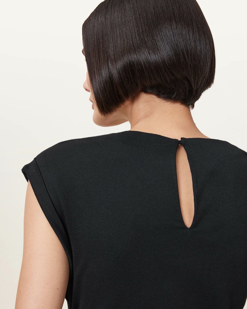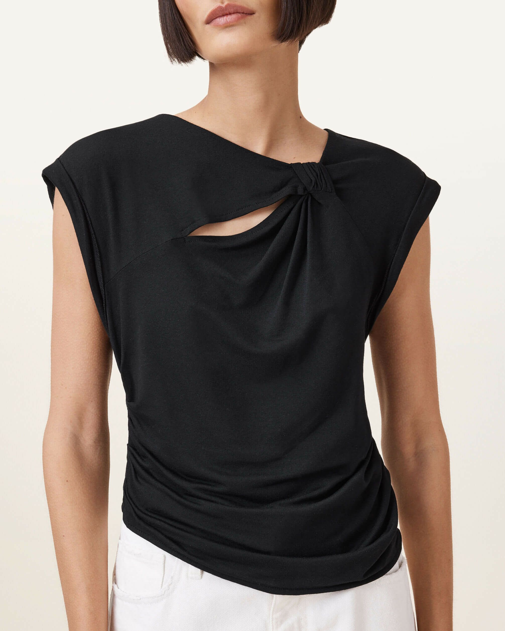 Robin スリーブレストップは、ストレッチジャージー素材で理想的なフィット感を実現。ネックラインの結び目ディテールが、シンプルなデザインにユニークなアクセントを加えています。