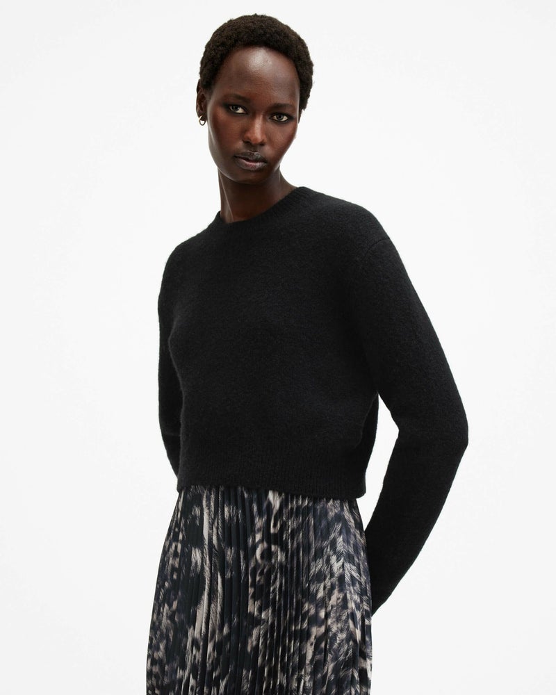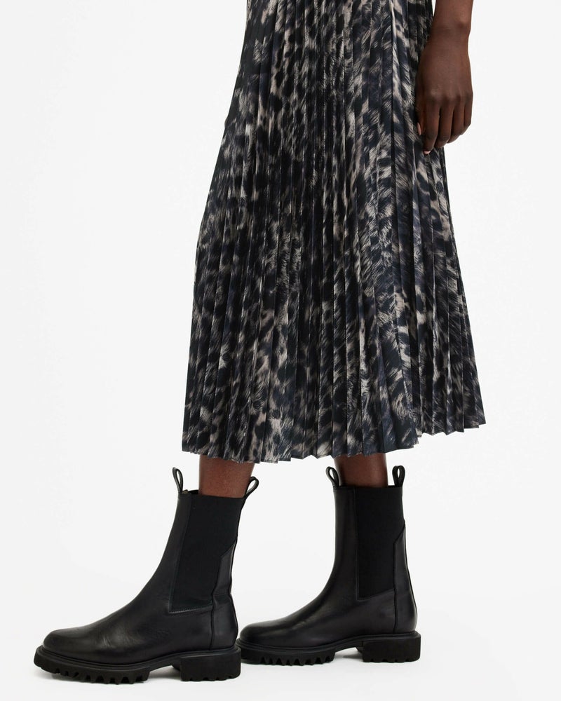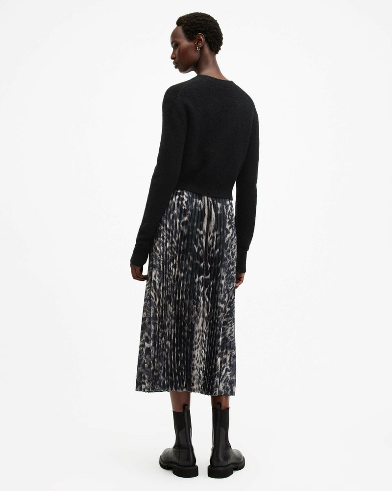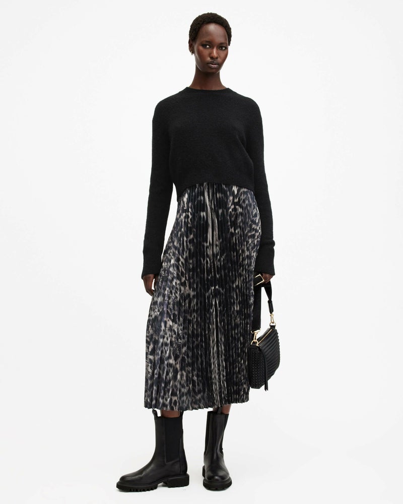 Jinx ドレスは、お気に入りを2つ—個性的なアニマルプリントと着心地のよいニット—のコンビ。この2つで冬のスタイリングに備えよう。ボトムレイヤーは、細かいプリーツの入ったレオパードプリントのマキシドレス。トップは、リブトリム付きのクラシックなクルーネック長袖ニット。セットまたは単独で着こなし可能。
