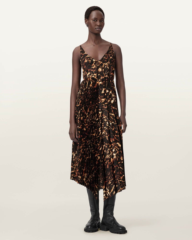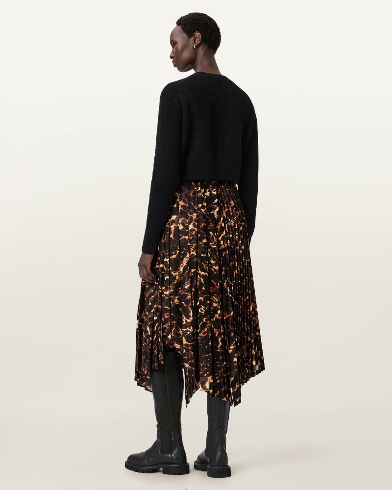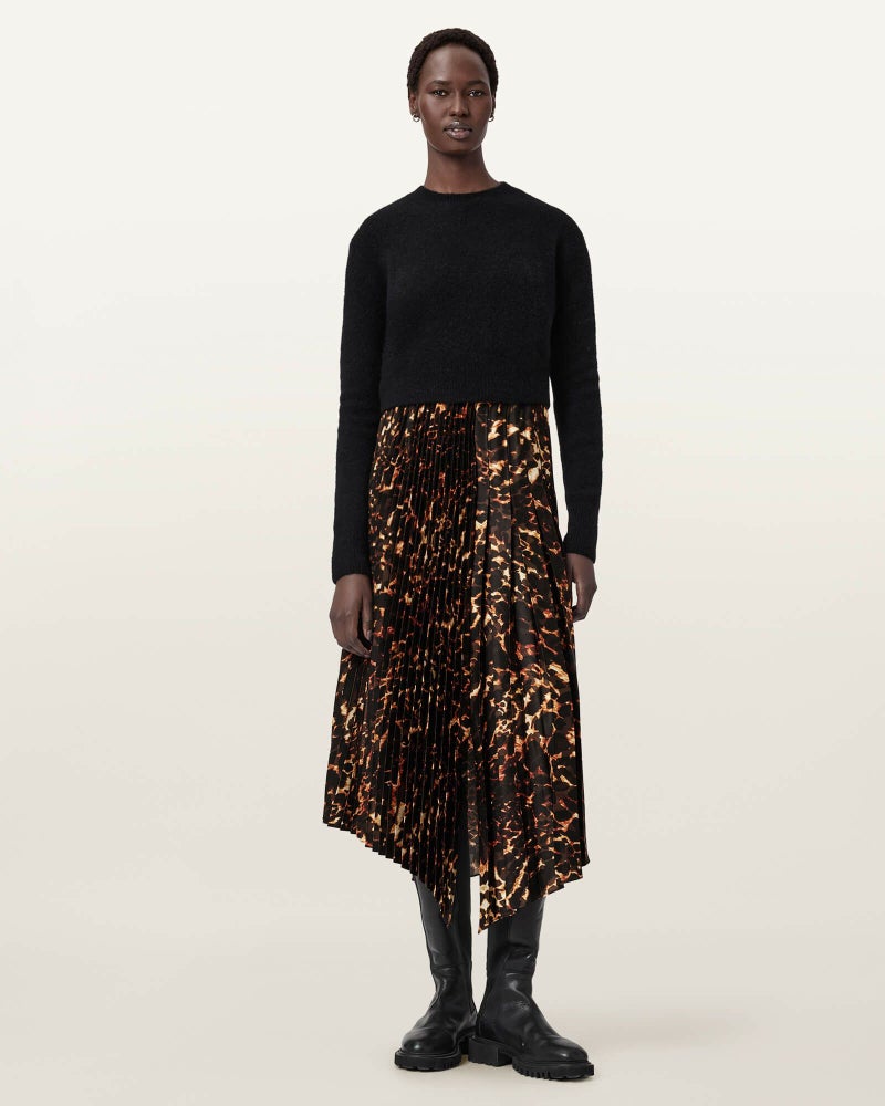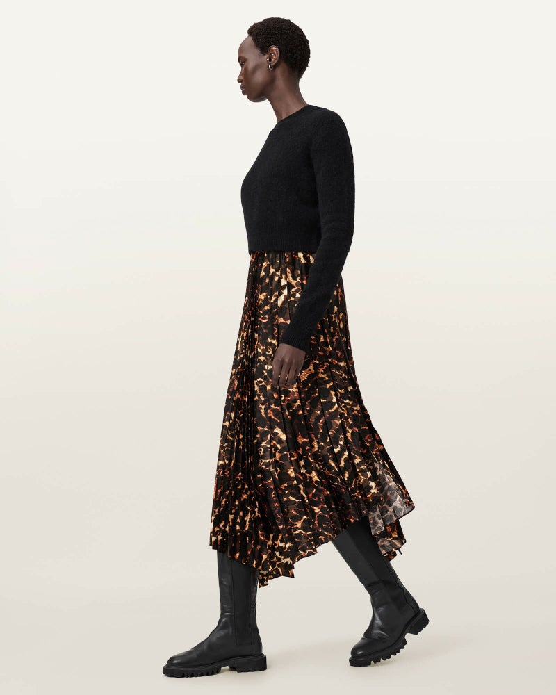 新しいPardusレオパードプリントのプリーツドレスに、クロップドのロングスリーブニットをレイヤード。