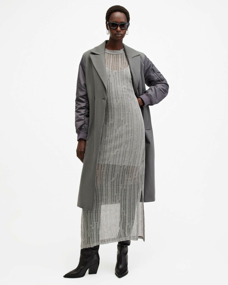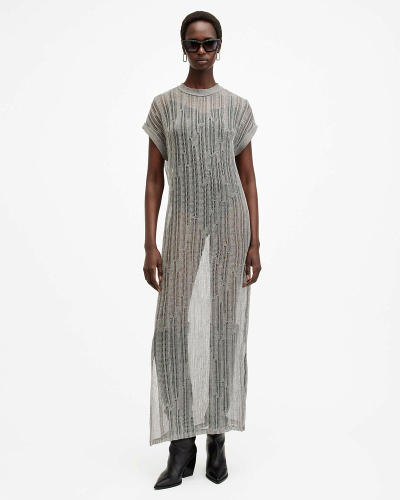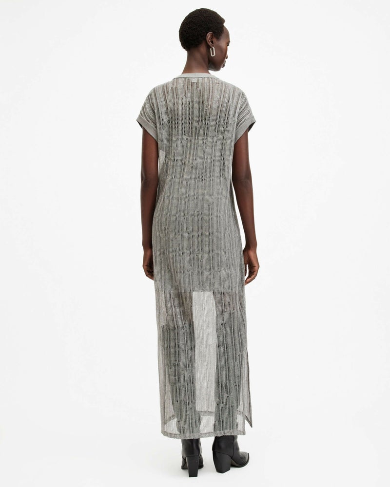 オールセインツでドレスアップ。Giana ドレスはオーガニックコットンとメタリックヤーンのブレンドファブリックを使用したシアーオープンニット。ゆったりしたドロップショルダーのリラックススリーブレスシェイプ。リブトリム仕上げのドレス。カジュアルな要素がエフォートレスな雰囲気。オールセインツステートメントレザーやオーバーサイズテーラードと相性抜群。
