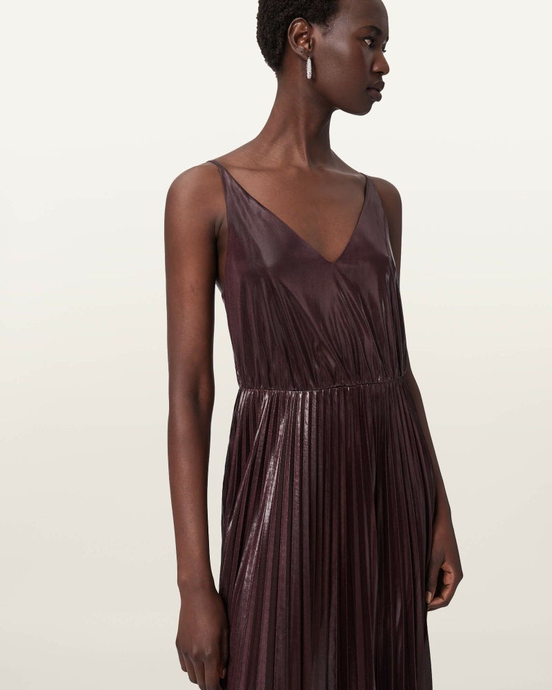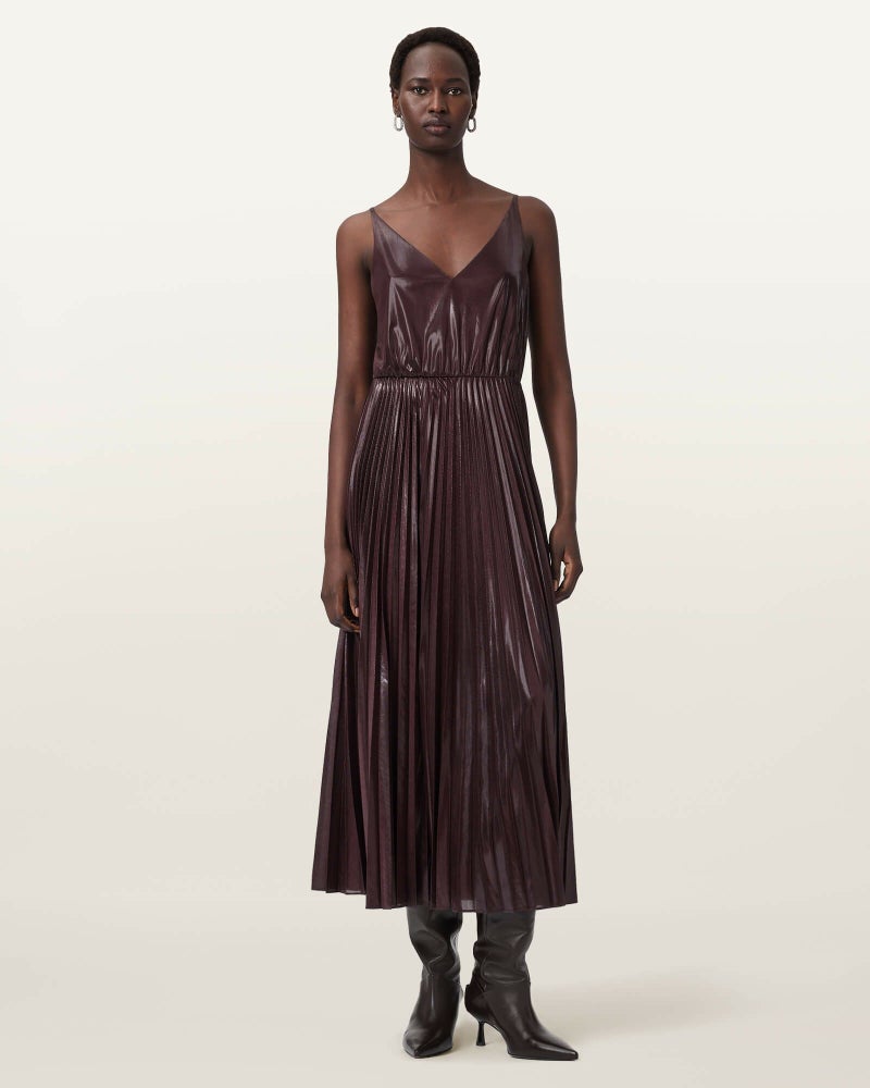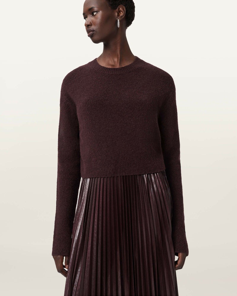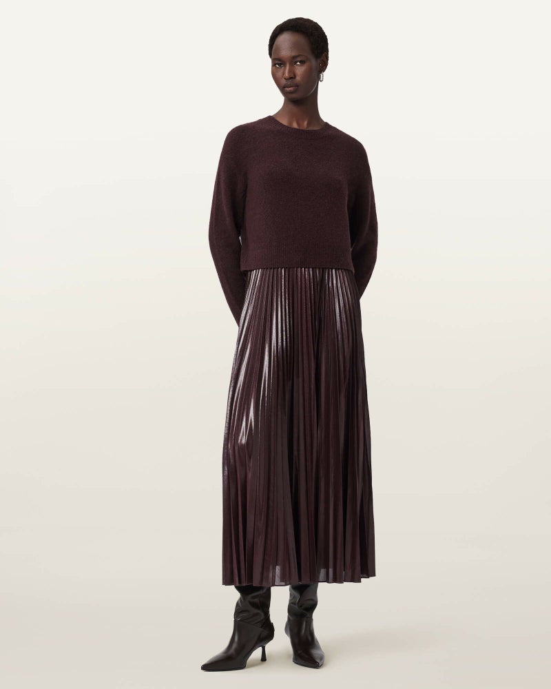 Spark ドレスは、プリーツのマキシスリップドレスに、柔らかなメリノニットを重ねたシンプルで洗練されたデザイン。