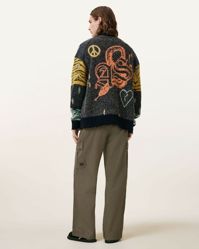 オールセインツのワークウェア、Flynn カーゴトラウザーはストレッチコットンを使用し、アングルパッチポケット、バックフラップポケット仕上げ。オーバーサイズフィットトラウザーをスリムフィットの白Tシャツ、ルーズフィットカーディガンと合わせて着こなそう。