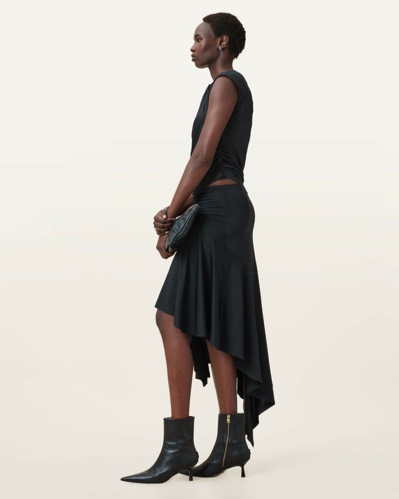 Annalie スカートは、新しいジャージースカートで、斜めに寄せられたギャザーディテールが特徴。ハイローのヘムラインが魅力的で、日常使いから夜のお出かけ、フェスやパーティーにも対応できる万能アイテム。トップスとアンクルブーツを合わせて。