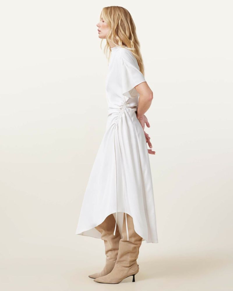 スタイリッシュなRosie ミディドレスは、ドレープカウルネックを備えたバイアスカットのシルエットがボディラインを引き立てるデザイン。スムーススリップ裏地付き。ポインテッドトゥのフラットシューズで上品に、バイカーブーツでエッジを効かせたスタイルもおすすめ。