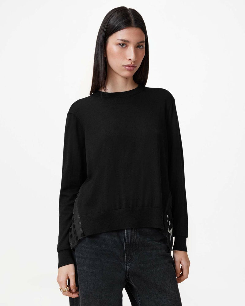 上質なニットウェアが登場。Dott ニットはライトウェイトメリノウールを使用した長袖ニット。背中にはプリーツ加工のポルカドットファブリックパネルをあしらい、動きをプラス。メタリックスリップドレスに重ねて、季節感のあるスタイリングの完成。