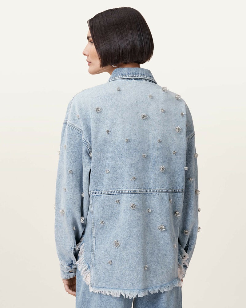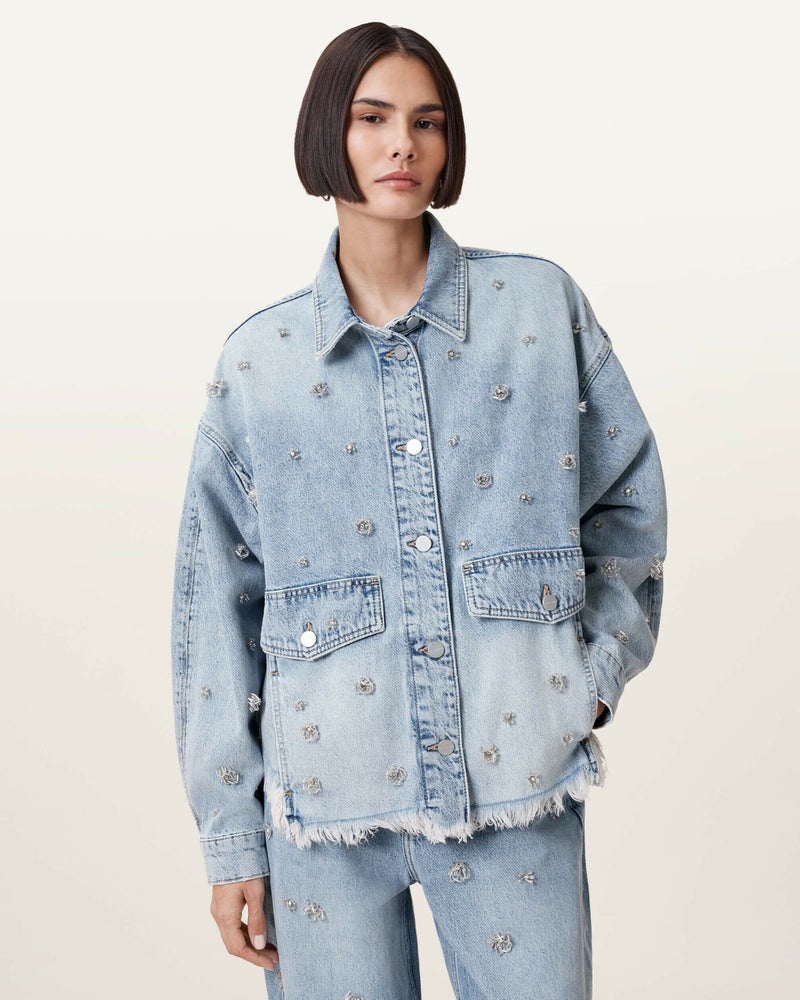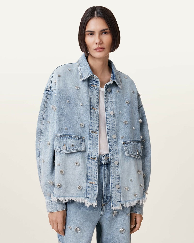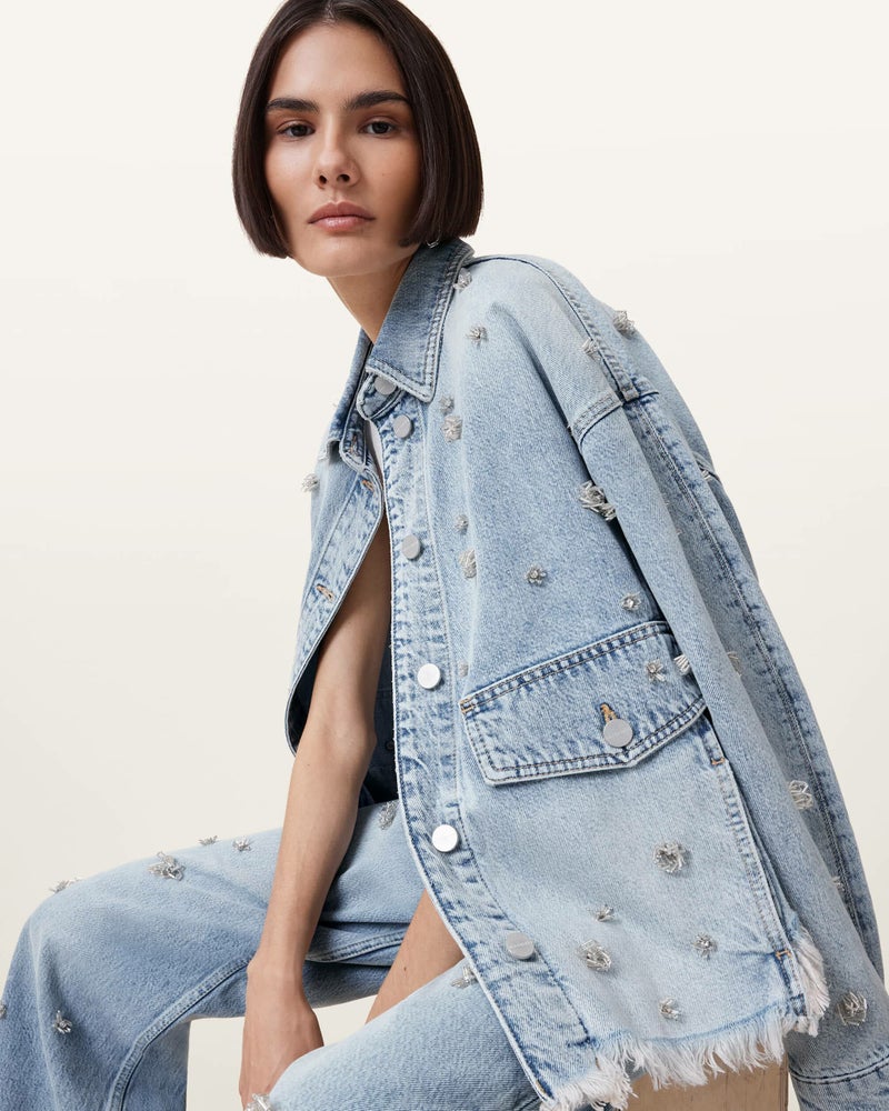Hettie シャケットは、デニムで作られたオーバーサイズのシャツシルエット。ドロップショルダー、フラップポケット、シルバートーンのボタンが特徴で、全体に施された装飾がポイント。ジャケットとしてもシャツとしても、あなたのスタイルで楽しんで。