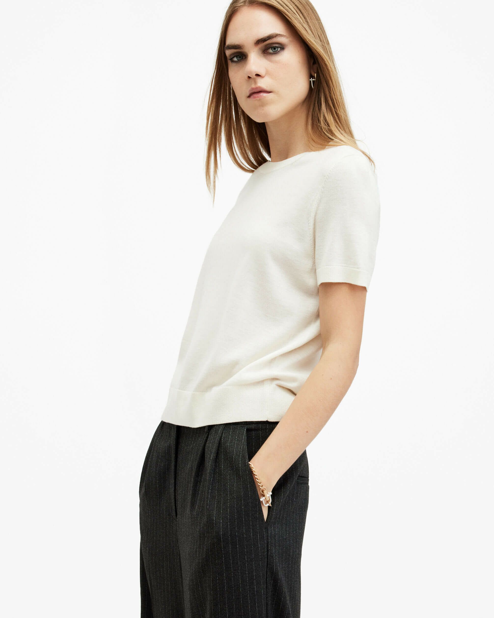 Bern Tシャツはクルーネック、リブトリム、非常にライトウェイトの半袖レギュラーフィットTシャツ。メリノウールを使用したやわらかい仕上げ。スカートやテーラードトラウザーに合わせやすいデザイン。