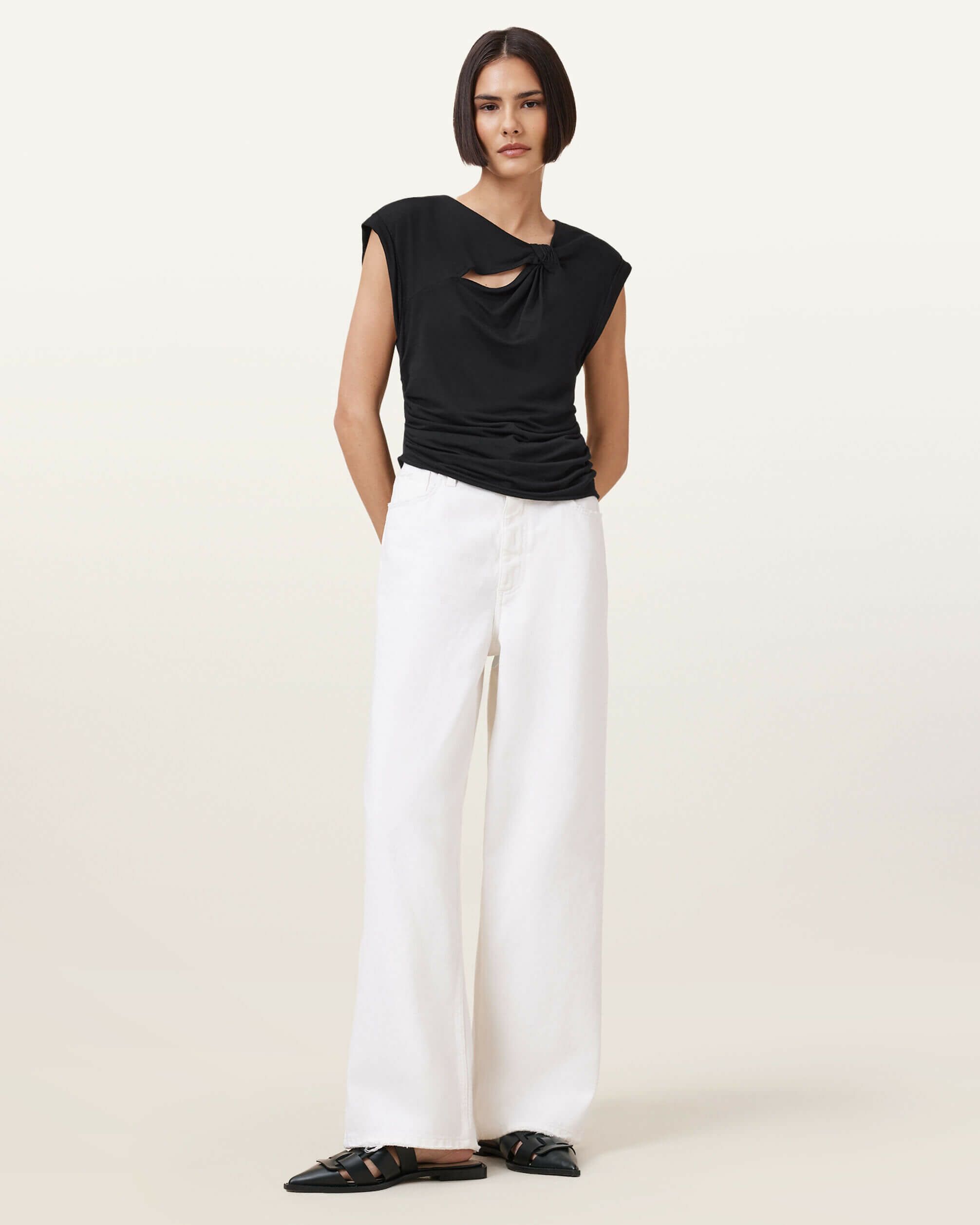 Robin スリーブレストップは、ストレッチジャージー素材で理想的なフィット感を実現。ネックラインの結び目ディテールが、シンプルなデザインにユニークなアクセントを加えています。