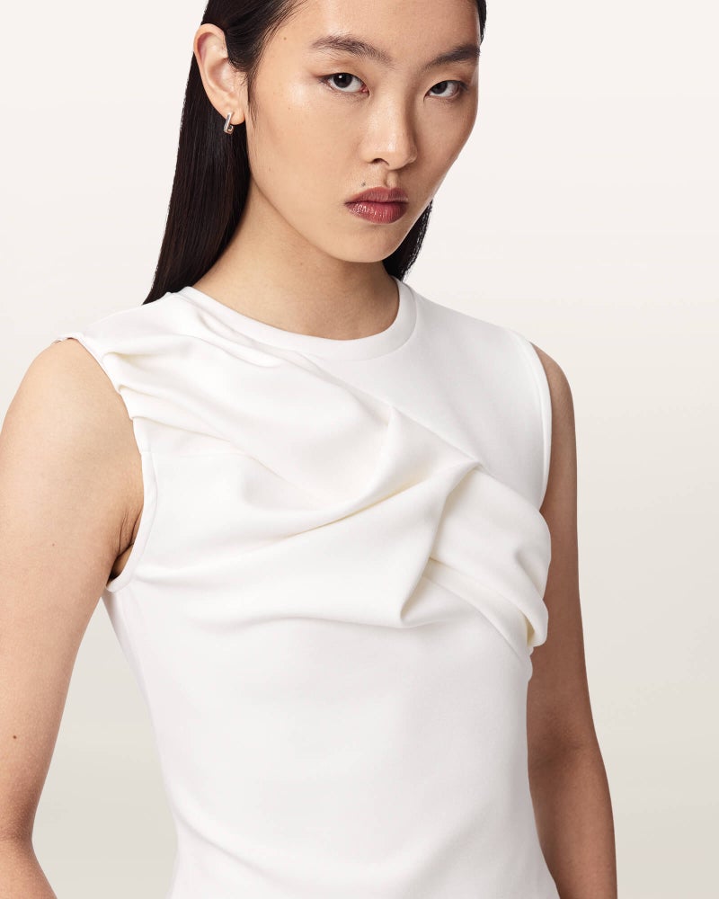 軽やかな素材に、スリーブレスのミニマルなシルエット。