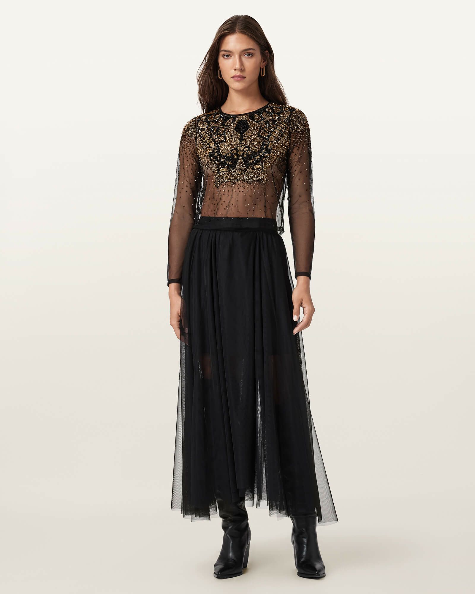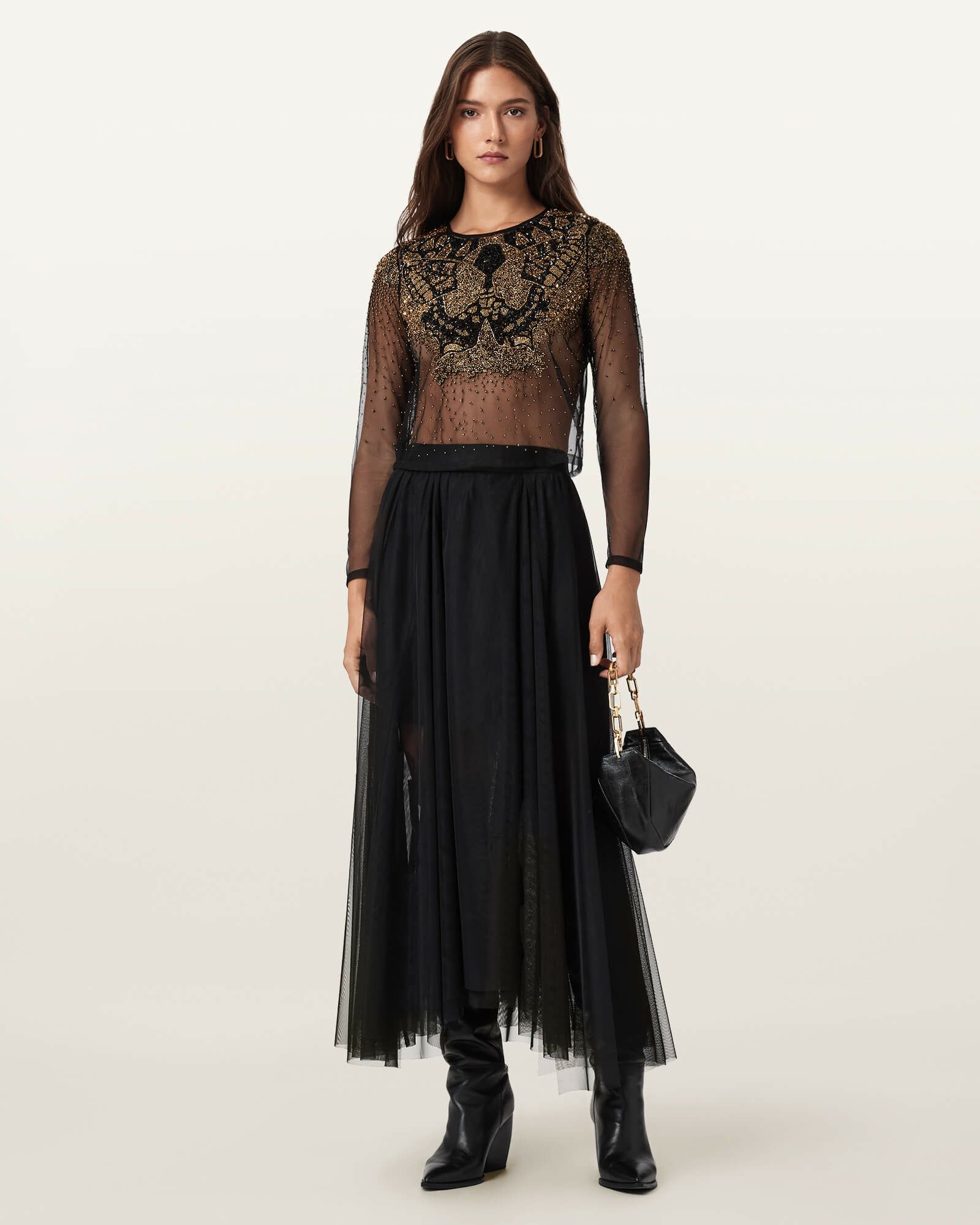 ゴシックなムードを纏ったAlly チュール ミディスカートが、ドレスアップをモダンに仕上げます。