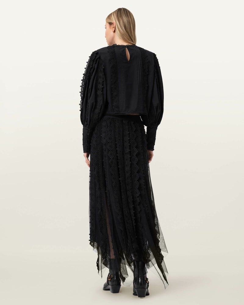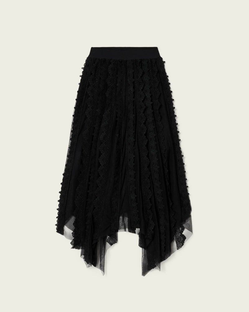 Vashtie マキシ スカート は、ケミカルレースとチュールがつくる存在感。