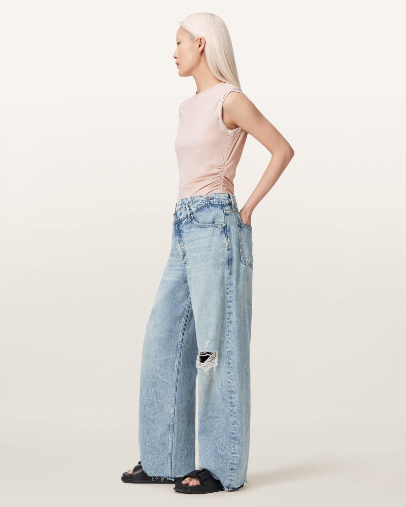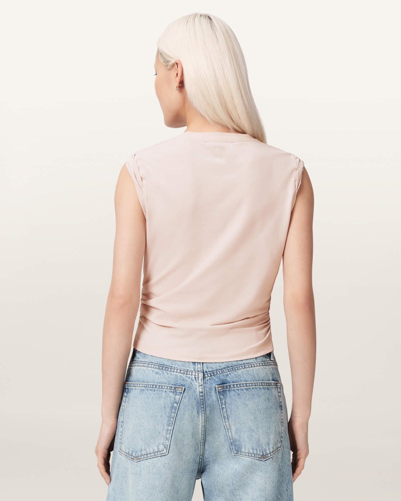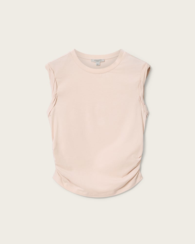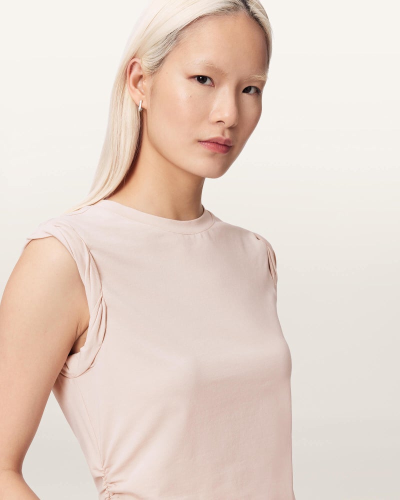 軽やかな素材で仕立てたスリーブレスシルエットに、サイドのルーシングディテール。