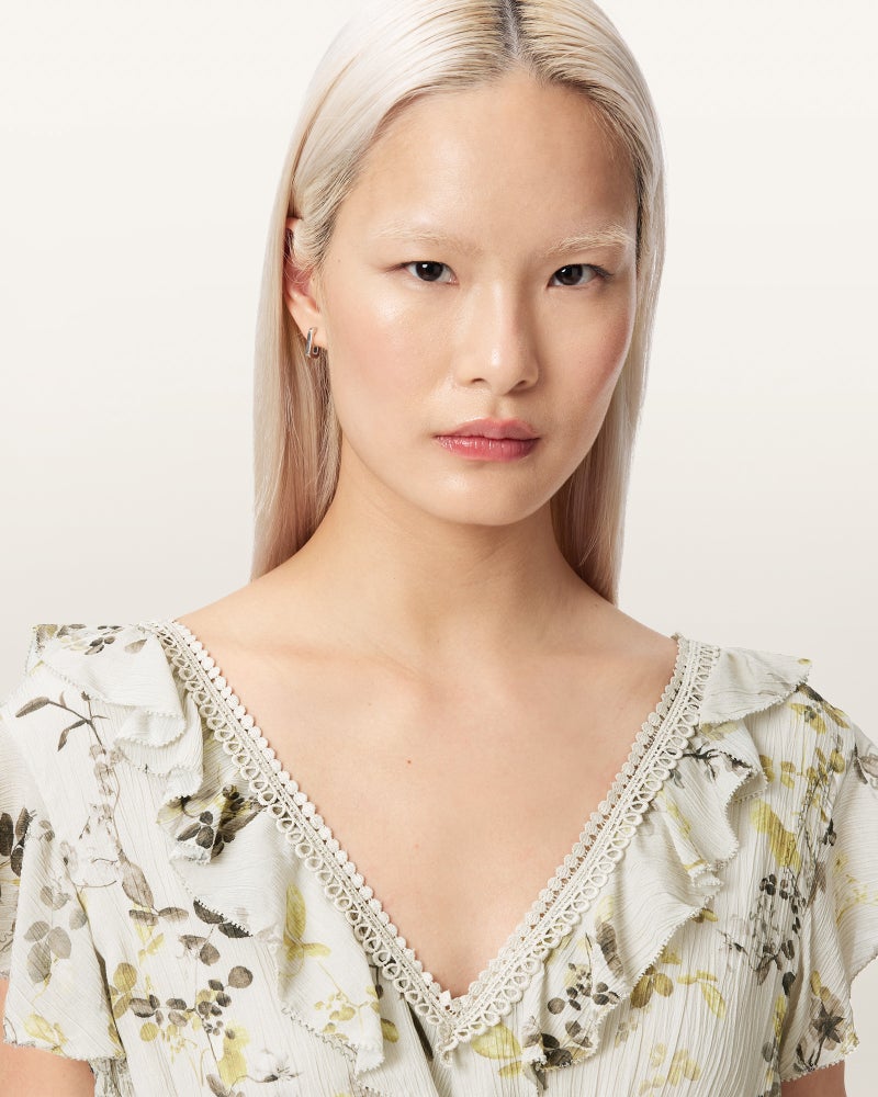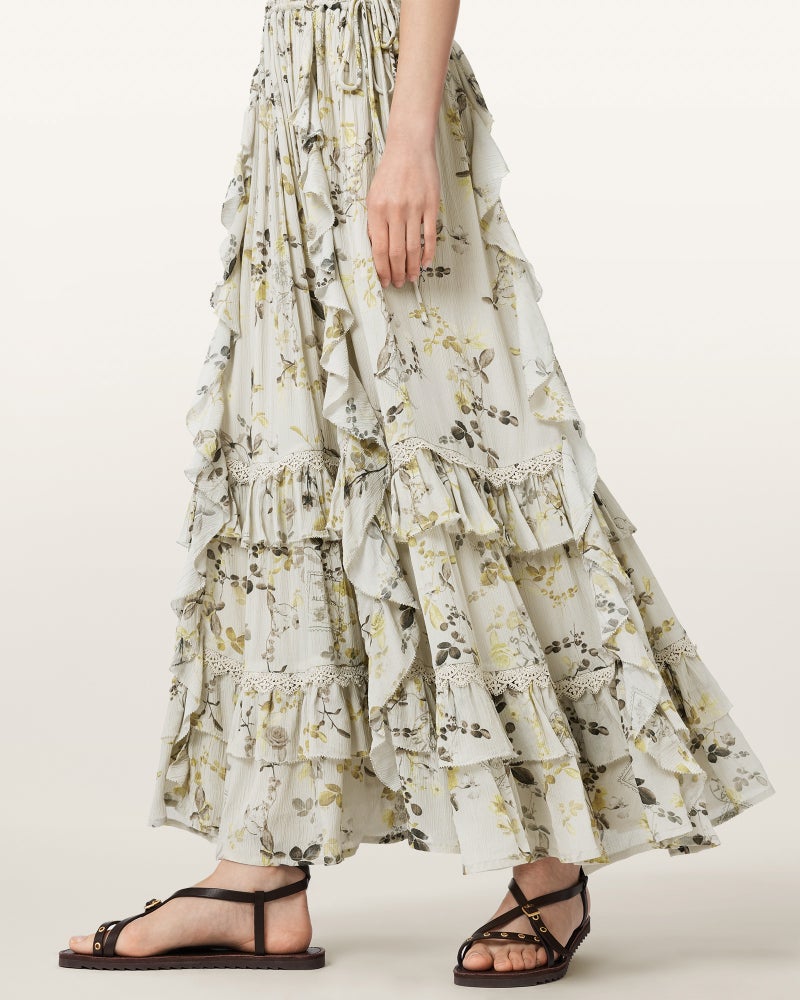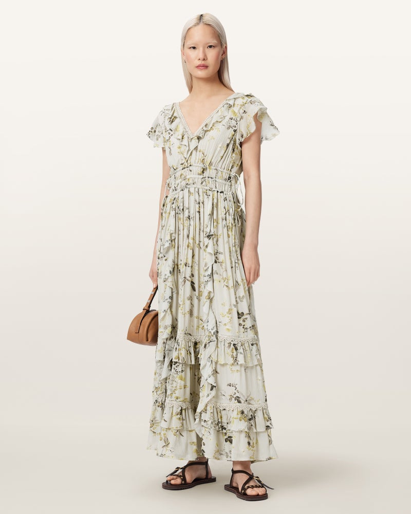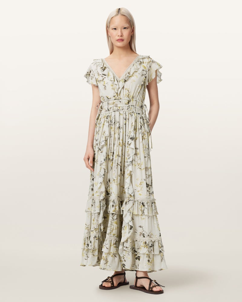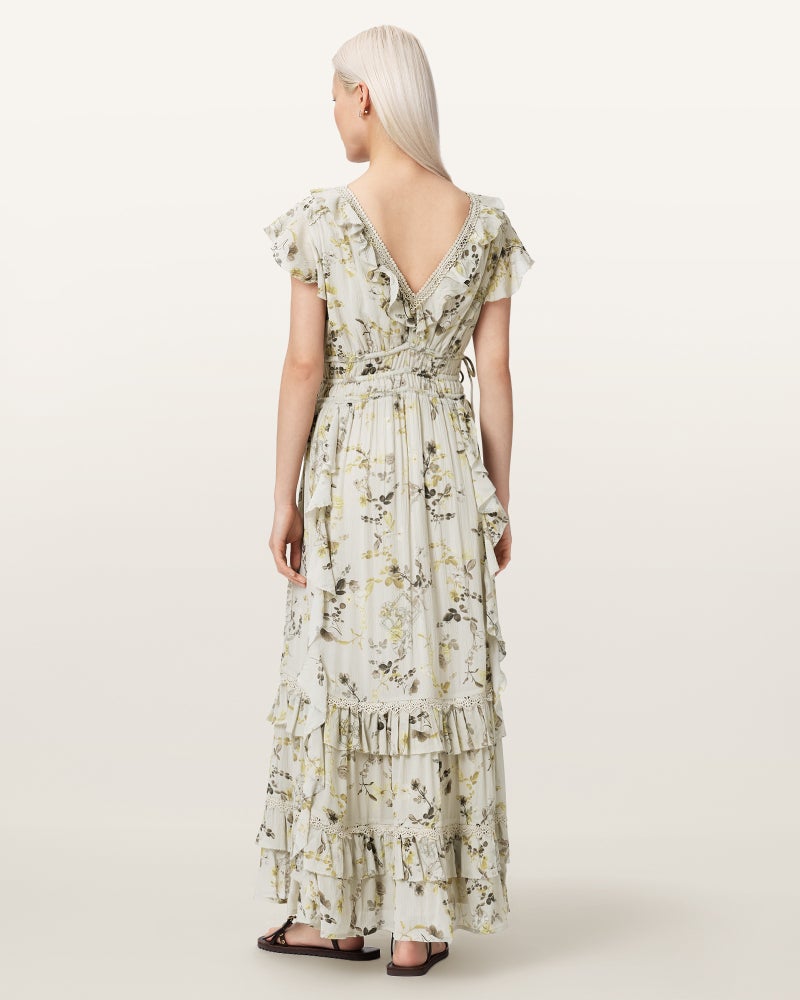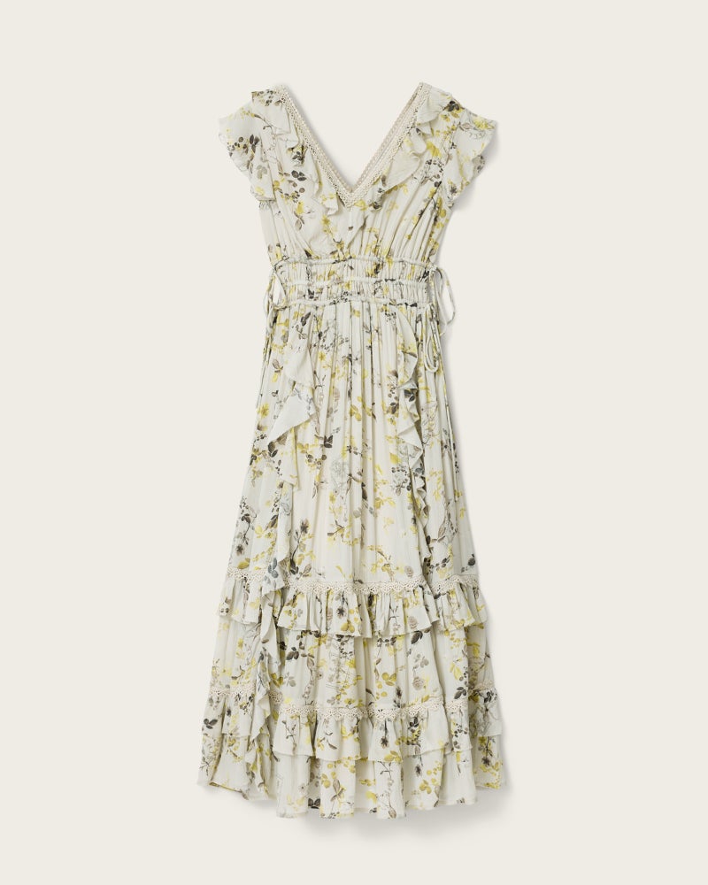 Canto マキシドレスは、フローラルプリントにティアードラッフルを重ねたデザイン。