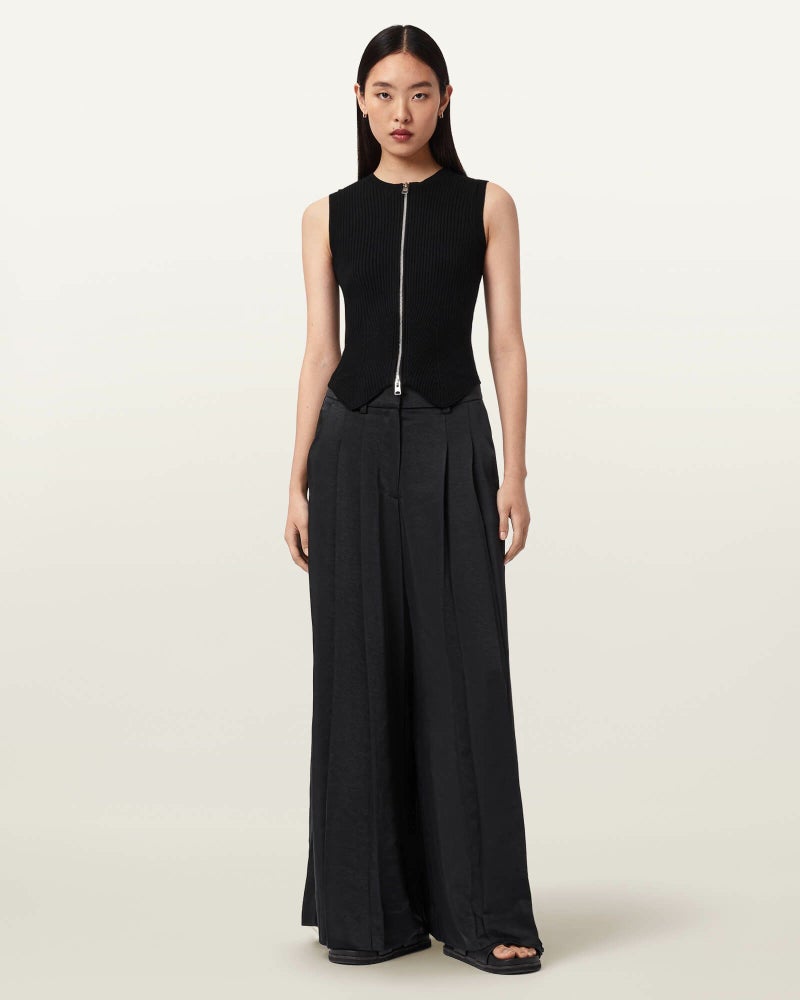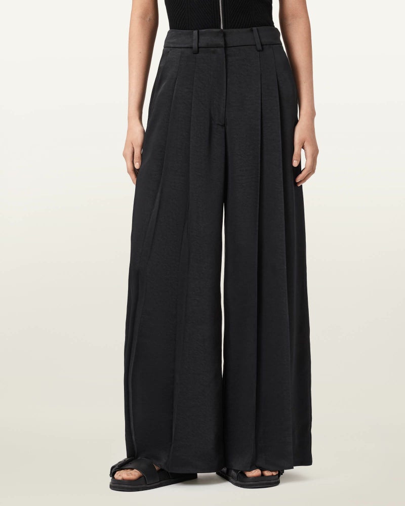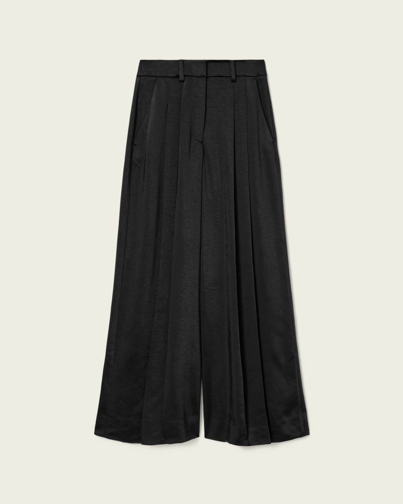 なめらかなサテン素材を、ワイドなプリーツシルエットで仕立てています。