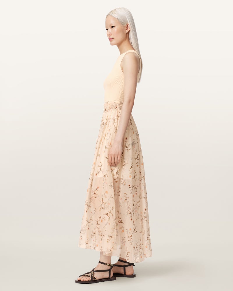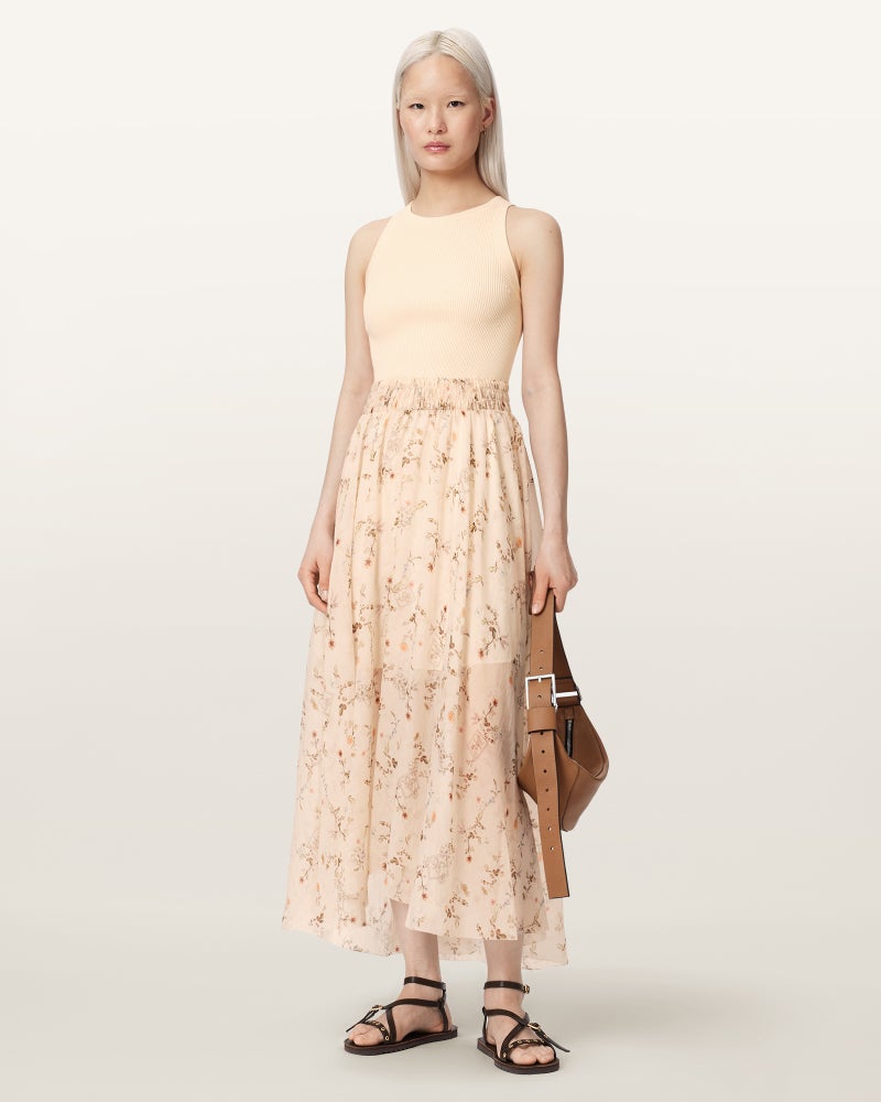 フィット感のあるトップに、Aラインのミディシルエット。