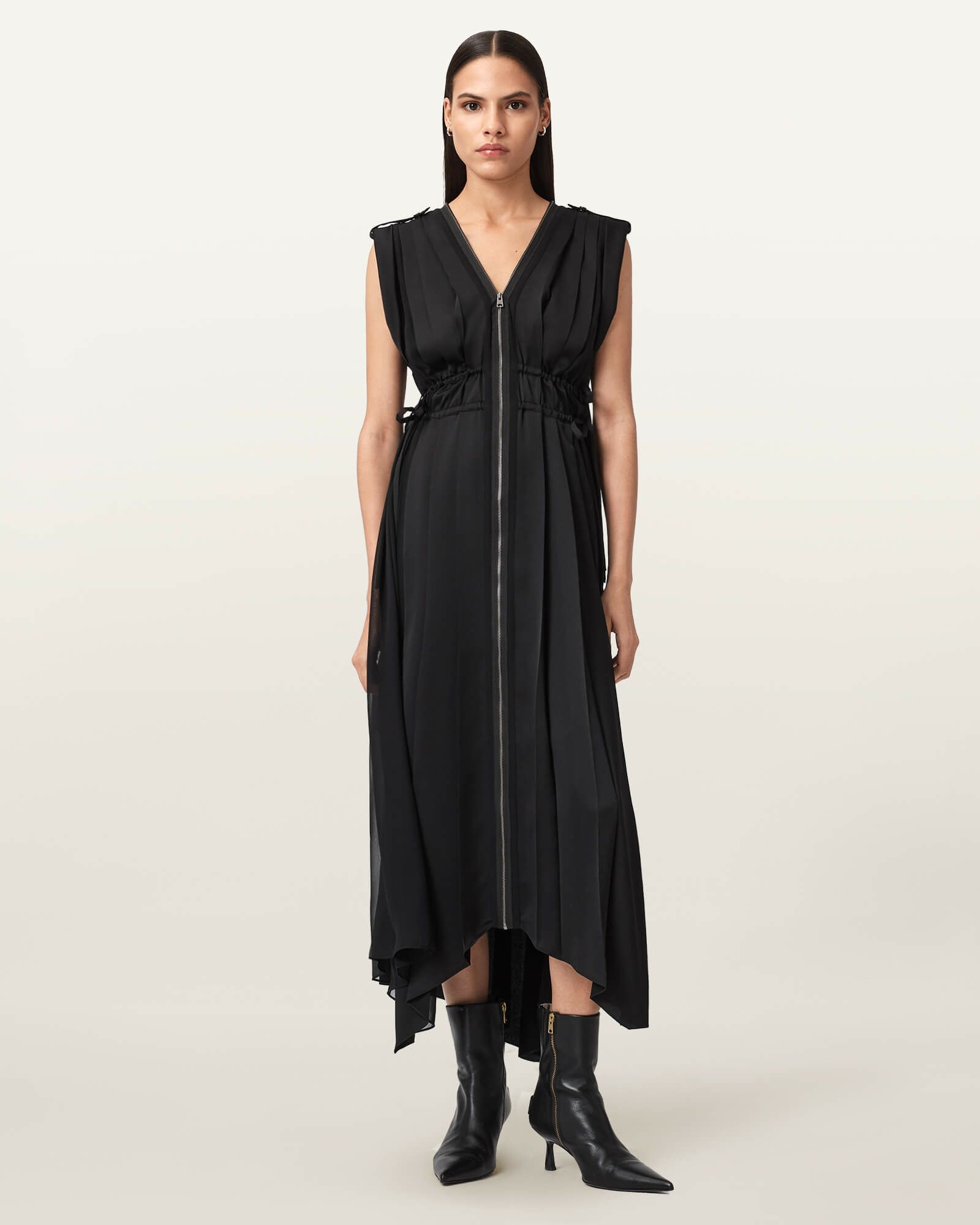 大胆なジップ使いで、フォーマルスタイルにエッジを添えて。