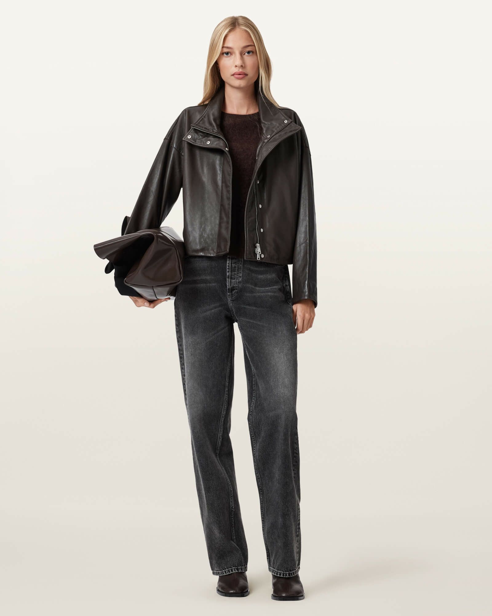 リラックス感のあるレザー仕立てで、ドロップショルダーとファネルネックが印象的。